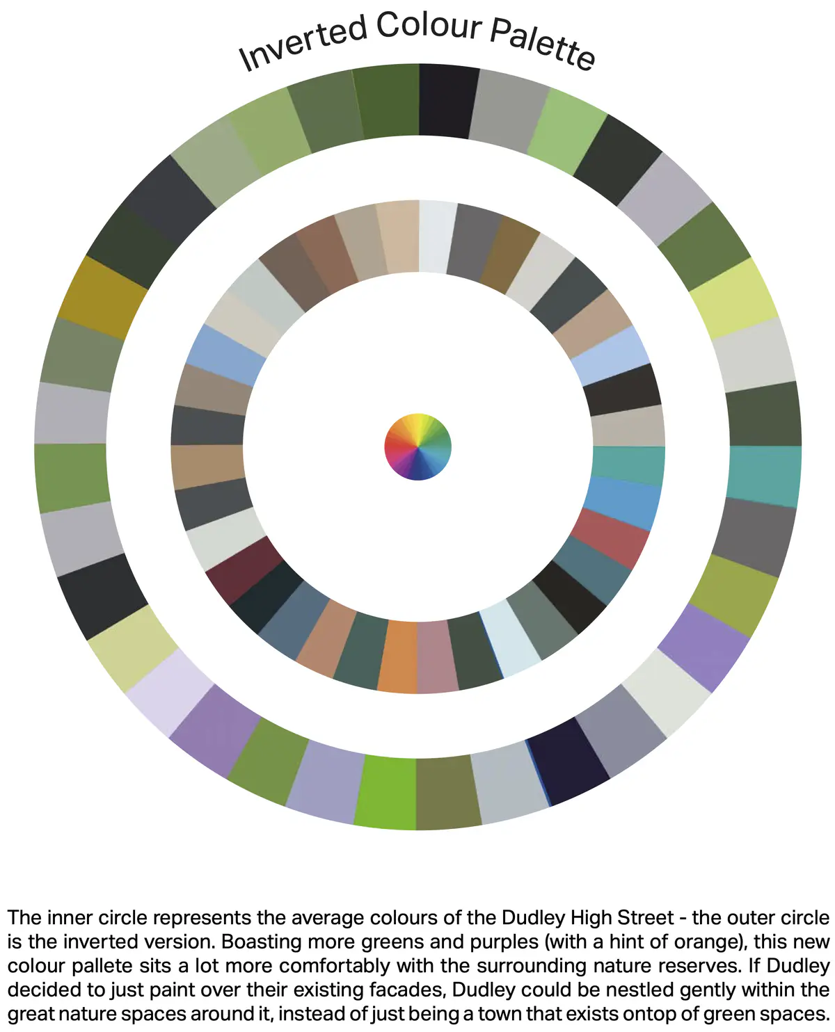 The inner circle represents the average colours of the Dudley High Street - the outer circle is the inverted version. Boasting more greens and purples (with a hint of orange), this new colour pallete sits a lot more comfortably with the surrounding nature reserves. If Dudley decided to just paint over their existing facades, Dudley could be nestled gently within the great nature spaces around it, instead of just being a town that exists ontop of green spaces.