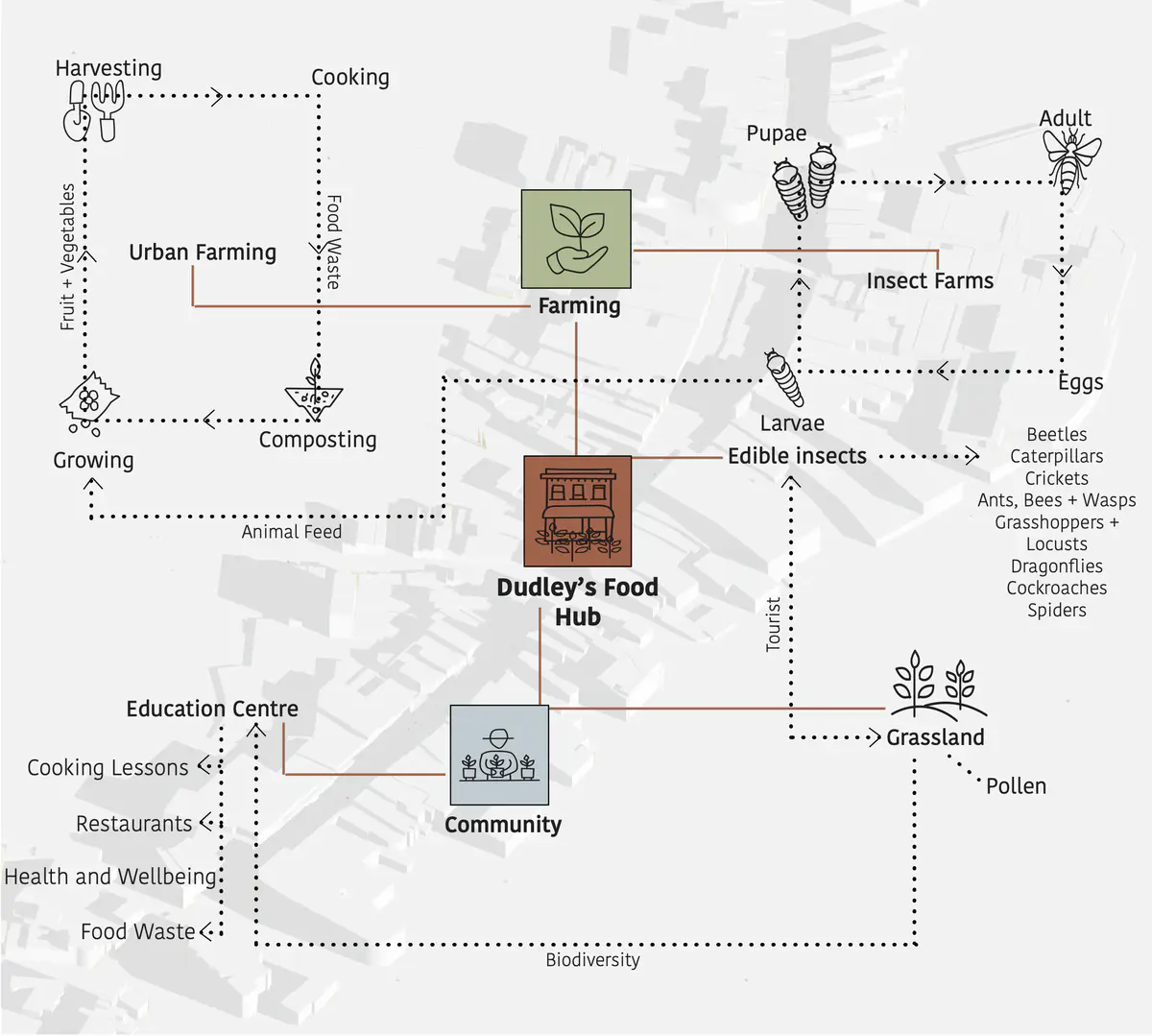 That said, this opens an opportunity. Instead of being a conservationist and repairing these buildings to their former glory, why not make them a statement piece within the high street. Possibly by placing a blanket ban on all of the current materials seen on the street. Instead, any repairs must be in Zero carbon / Carbon negative materials. This could then become an educational street with great architectural character. Both combined may increase the high streets footfall.