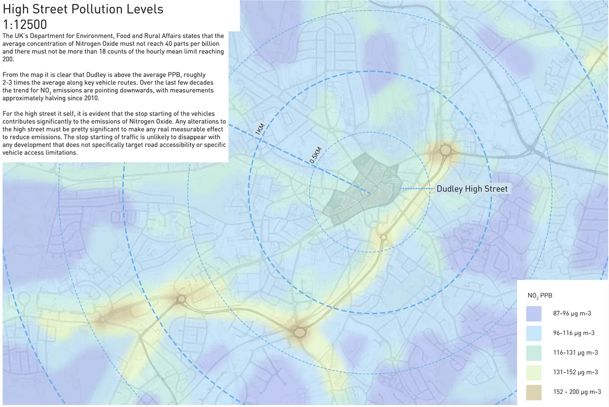 High Street Pollution Levels The UK’s Department for Environment, Food and Rural Affairs states that the average concentration of Nitrogen Oxide must not reach 40 parts per billion and there must not be more than 18 counts of the hourly mean limit reaching 200. From the map it is clear that Dudley is above the average PPB, roughly 2-3 times the average along key vehicle routes. Over the last few decades the trend for NO2 emissions are pointing downwards, with measurements approximately halving since 2010. For the high street it self, it is evident that the stop starting of the vehicles contributes significantly to the emissions of Nitrogen Oxide. Any alterations to the high street must be pretty significant to make any real measurable effect to reduce emissions. The stop starting of traffic is unlikely to disappear with any development that does not specifically target road accessibility or specific vehicle access limitations.