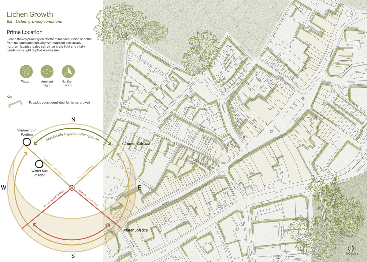 Lichen thrives primarily on Northern facades, it also benefits from moisture and humidity. Although not exclusively northern facades it also can thrive in the light and vitally needs some light to photosynthesize. - Michelle Gartside Lichen Growth.png