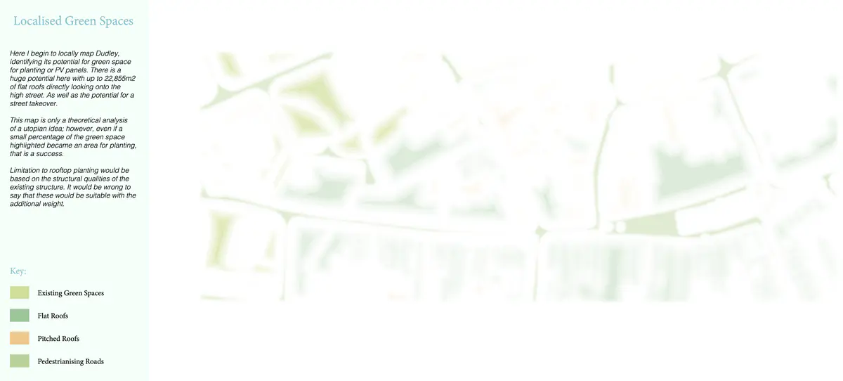 Localised Green Spaces Here I begin to locally map Dudley, identifying its potential for green space for planting or PV panels. There is a huge potential here with up to 22,855m2 of flat roofs directly looking onto the high street. As well as the potential for a street takeover. This map is only a theoretical analysis of a utopian idea; however, even if a small percentage of the green space highlighted became an area for planting, that is a success. Limitation to rooftop planting would be based on the structural qualities of the existing structure. It would be wrong to say that these would be suitable with the additional weight.