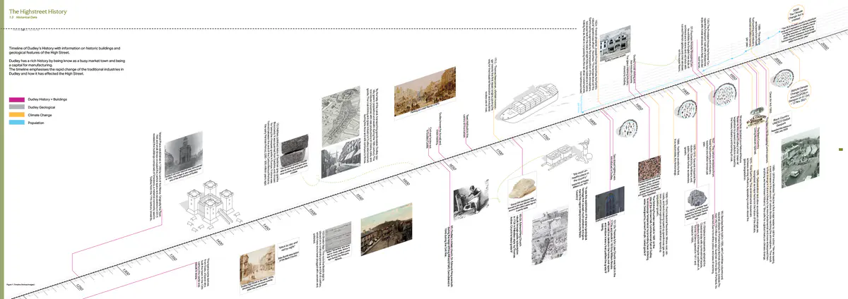 The timeline emphasises the rapid change of the traditional industries in Dudley and how it has effected the High Street.